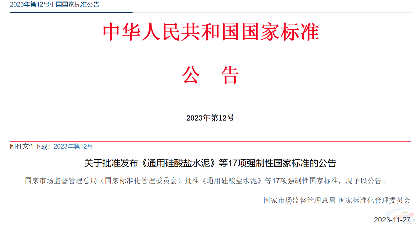11月27日,国家市场监督管理总局(国家标准化管理委员会)批准《通用硅酸盐水泥》等17项强制性国家标准,现予以公告。